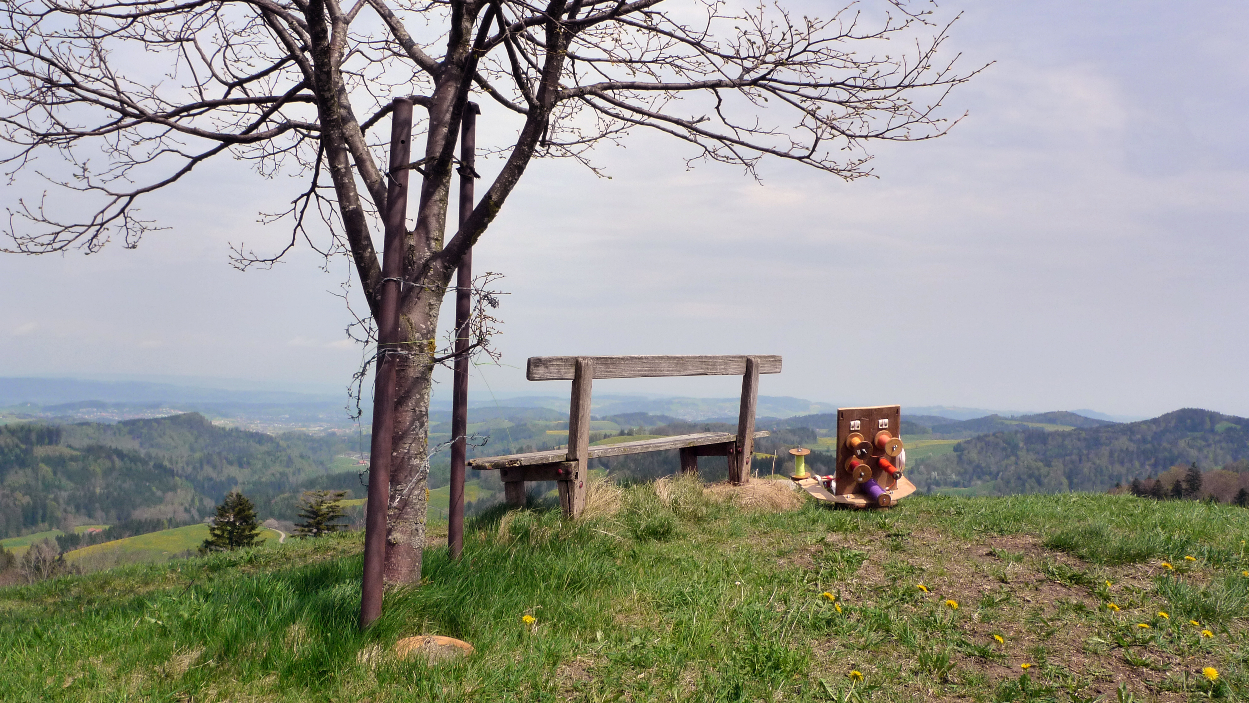 Mit einem Wollfaden aus verschiedenen Farben wandert Bignia Wehrli eine 7.74 km lange Wegstrecke von Heiletsegg bis Allenwinden durch die Landschaft ihrer Heimat im Zürcher Oberland und verstrickt den anschliessend wieder aufgerollten Faden in ein komplettes Outfit: Das Hörnli in einen Mantel, den Steinenbach in einen Schal, eine erkletterte Buche in einen Fingerschmuck. Die Wollfarben stehen in Relation zur Höhe über Meer und wechseln in 40-Meter-Schritten entlang der Regenbogen- Farbskala von Rostrot (720 müM) bis Violett (1120 müM). Die Kleidungsstücke lassen sich wie Landkarten lesen.